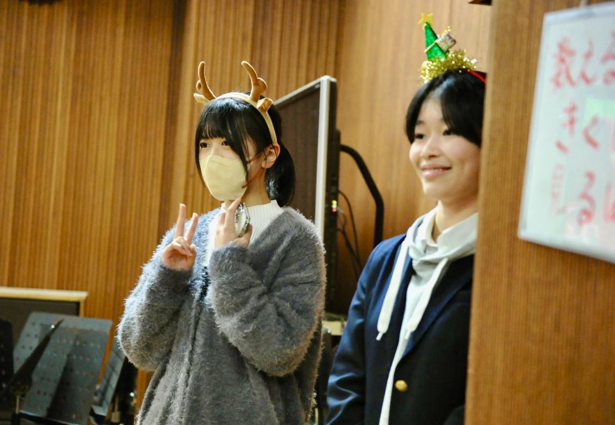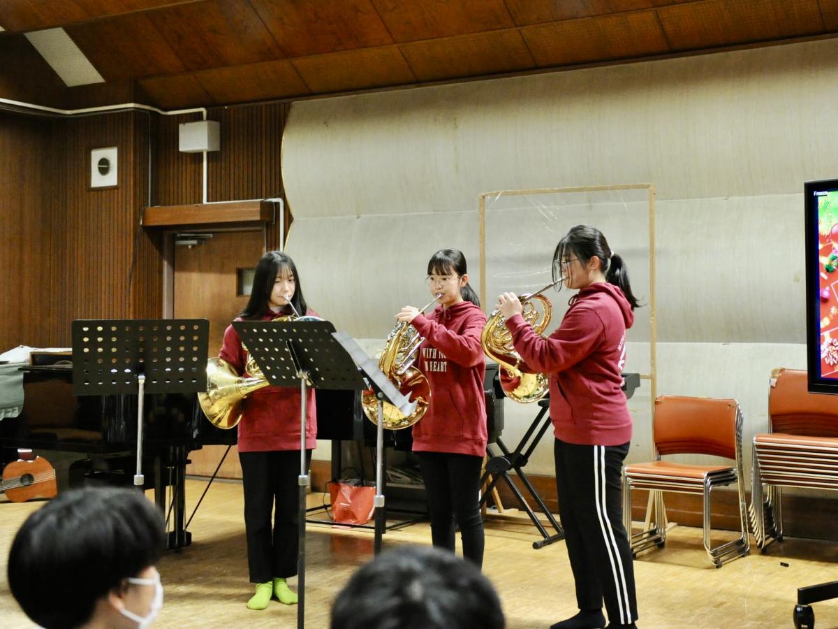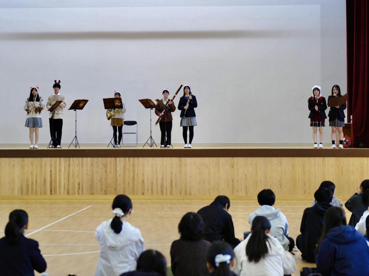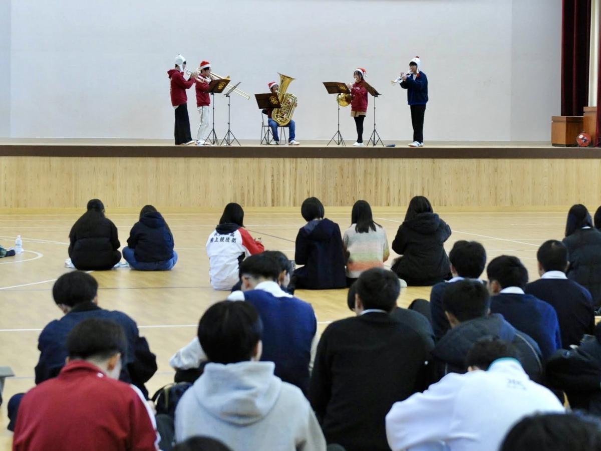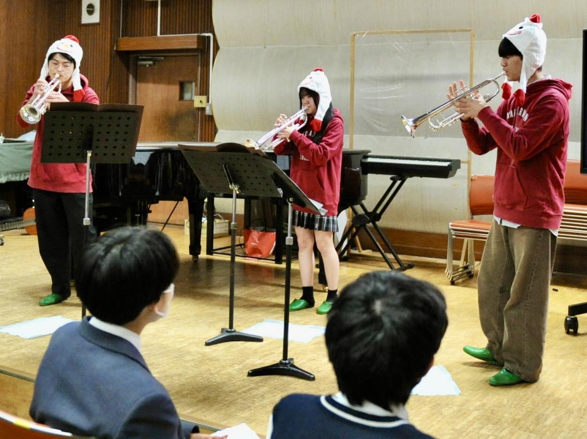 昼休みのピロティで、吹奏楽部がクリスマスミニコンサートを行っていました。