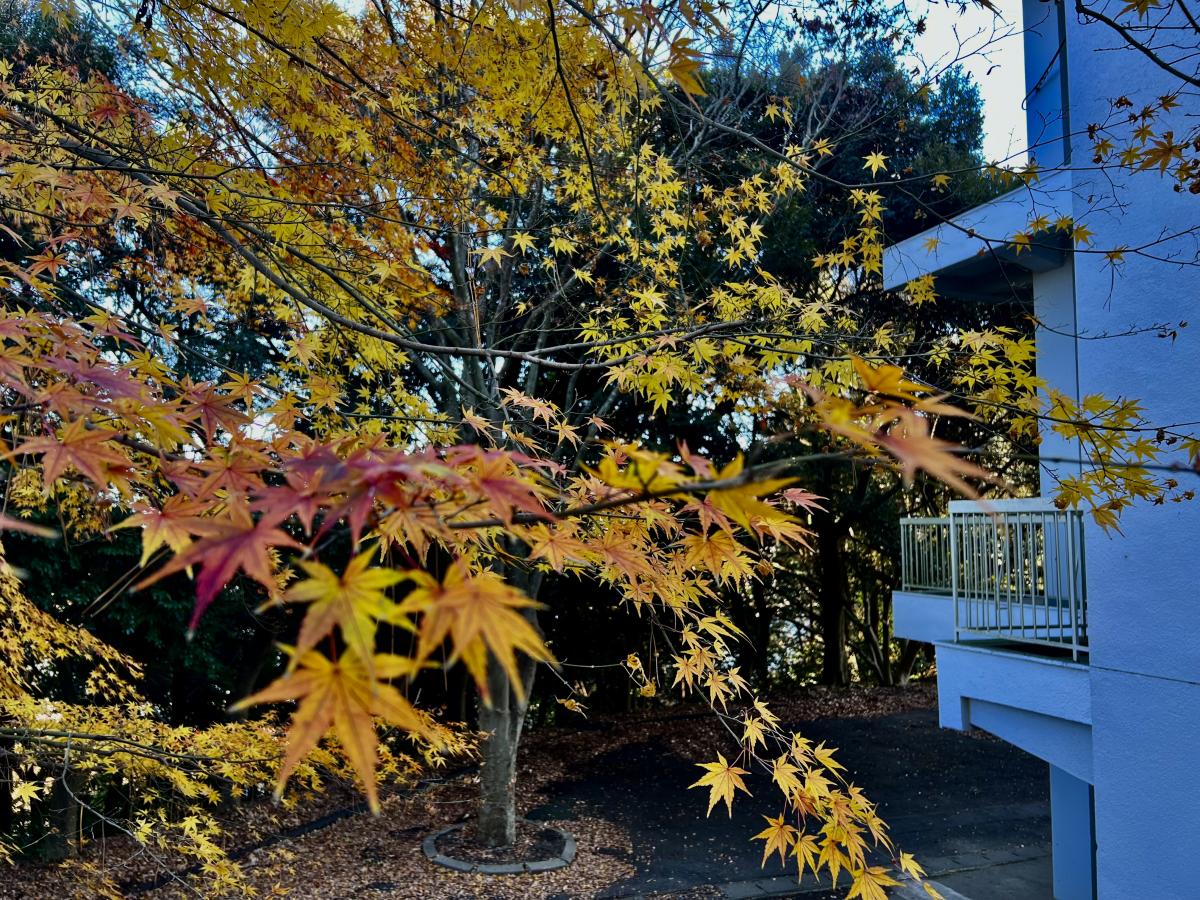 体育館裏の日当たりの悪い場所にあるモミジは葉を長く保ち、いま色鮮やかに