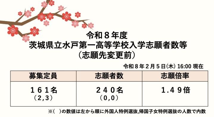 2026. 2. 5 「水戸一高の風景」のページに「プロ野球の日」の記事を掲載しました。 2026. 2. 4 「水戸一高の風景」のページに「願書受付開始」の記事を掲載しました。 2026. 2. 3 「水戸一高の風景」のページに「菊池謙二郎忌」の記事を掲載しました。 2026. 2. 2 「水戸一高の風景」のページに「如月」の記事を掲載しました。 2026. 1.30 「水戸一高の風景」のページに「高3最後の授業」の記事を掲載しました。 2026. 1.29 「水戸一高の風景」のページに「高3最後の集会」の記事を掲載しました。 「学校行事 月間行事予定」のページを更新しました。 「医学コースの実践」のページに「茨城県医師会主催高校生医療作文コンクールで表彰」の記事を掲載しました。 2026. 1.28 「水戸一高の風景」のページに「NIE」の記事を掲載しました。 2026. 1.27 「水戸一高の風景」のページに「国旗制定記念日」の記事を掲載しました。 2026. 1.26 「水戸一高の風景」のページに「穂洲忌」の記事を掲載しました。 「教育改革」のページのリンクを修正しました。 2026. 1.24 「水戸一高の風景」のページに「DIGITAL YOUTH EXPO 2025」の記事を掲載しました。 2026. 1.23 「水戸一高の風景」のページに「台湾トップ校の来校」の記事を掲載しました。 「教育改革」のページを新設し「教育改革」「授業改善推進への取り組み」を掲載しました。 2026. 1.22 「水戸一高の風景」のページに「医師会表彰」の記事を掲載しました。 2026. 1.19 「水戸一高の風景」のページに「共通テスト自己採点」の記事を掲載しました。 「部活動の紹介」のページの「硬式野球部」の記事を更新しました。 「保健室から」のページの「保健だより」の記事を更新しました。 2026. 1.16 「水戸一高の風景」のページに「共通テストに向けて」の記事を掲載しました。 2026. 1.15 「水戸一高の風景」のページに「手洗いの日」の記事を掲載しました。 2026. 1.13 「水戸一高の風景」のページに「海外派遣(米国)」の記事を掲載しました。 2026. 1. 9 「水戸一高の風景」のページに「入学者選抜準備」の記事を掲載しました。 2026. 1. 8 「水戸一高の風景」のページに「正月事納め」の記事を掲載しました。 2026. 1. 7 「水戸一高の風景」のページに「萬馬奔騰」の記事を掲載しました。 2026. 1. 1 「水戸一高の風景」のページに「新年の御挨拶」の記事を掲載しました。 2025.12.24 「医学コースの実践」のページに「2学年第3回医学セミナー」の記事を掲載しました。 「事務室からのお知らせ」のページに、「年末年始の卒業生に係る証明書の申請及び交付について」の 記事を掲載しました。 2025.12.23「水戸一高の風景」のページに「集会・演劇公演」の記事を掲載しました。 2025.12.22「水戸一高の風景」のページに「クリスマスコンサート」の記事を掲載しました。 2025.12.19「水戸一高の風景」のページに「ラストLHR」「共通テスト対策」の記事を掲載しました。 2025.12.18「水戸一高の風景」のページに「探究成果クラス発表」「性教育講演会」の記事を掲載しました。 2025.12.17「水戸一高の風景」のページに「飛行機の日」の記事を掲載しました。 2025.12.16「水戸一高の風景」のページに「最後の一葉」の記事を掲載しました。 2025.12.15「水戸一高の風景」のページに「クリスマス・新年に向けて」の記事を掲載しました。 2025.12.12「水戸一高の風景」のページに「水戸一の熊」の記事を掲載しました。 2025.12.11「水戸一高の風景」のページに「キャリア探究対話」の記事を掲載しました。 2025.12.10「水戸一高の風景」のページに「人権デー」の記事を掲載しました。 2025.12. 9 「水戸一高の風景」のページに「漱石忌」の記事を掲載しました。 2025.12. 8 「水戸一高の風景」のページに「開戦の日」の記事を掲載しました。 2025.12. 5 「水戸一高の風景」のページに「世界土壌デー」の記事を掲載しました。 2025.12. 4 「水戸一高の風景」のページに「実力試験・校内模試・スピーキングテスト」の記事を掲載しました。 2025.12. 3 「水戸一高の風景」のページに「カレンダーの日」の記事を掲載しました。 「医学コースの実践」のページに「第1学年筑波大学による医学セミナー」の記事を掲載しました。 2025.12. 2 「水戸一高の風景」のページに「ウォータークーラー」の記事を掲載しました。 2025.12. 1 「水戸一高の風景」のページに「師走」の記事を掲載しました。 2025.11.28「水戸一高の風景」のページに「学校公開」の記事を掲載しました。 2025.11.27「水戸一高の風景」のページに「郡司次郎正」の記事を掲載しました。 2025.11.26「水戸一高の風景」のページに「研究授業」の記事を掲載しました。 2025.11.25「水戸一高の風景」のページに「定例生徒集会」の記事を掲載しました。 「卒業生のみなさんへ」のページに「合格大学調査への回答のお願い」の記事を掲載しました。 2025.11.22「水戸一高の風景」のページに「創立記念日」の記事を掲載しました。 2025.11.21「水戸一高の風景」のページに「体育館55周年」の記事を掲載しました。 