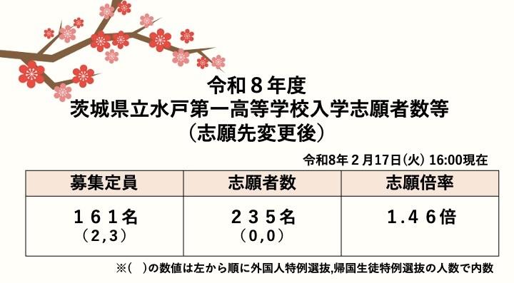2026. 2. 19「水戸一高の風景」のページに「雨水」の記事を掲載しました。 「教育改革」のページに「授業公開」の記事を掲載しました。 2026. 2. 18「水戸一高の風景」のページに「衛生委員会」の記事を掲載しました。 2026. 2. 17「水戸一高の風景」のページに「発表会に向けて」の記事を掲載しました。 2026. 2. 16「水戸一高の風景」のページに「ビブリオバトル」の記事を掲載しました。 2026. 2. 13「水戸一高の風景」のページに「ハートマーク」の記事を掲載しました。 2026. 2. 12「水戸一高の風景」のページに「梅まつり」の記事を掲載しました。 2026. 2. 10「水戸一高の風景」のページに「ふとんの日」の記事を掲載しました。 2026. 2. 7 「水戸一高の風景」のページに「ハーフパイプ」の記事を掲載しました。 2026. 2. 6 「水戸一高の風景」のページに「小さなお客さま」の記事を掲載しました。 2026. 2. 5 「水戸一高の風景」のページに「プロ野球の日」の記事を掲載しました。 2026. 2. 4 「水戸一高の風景」のページに「願書受付開始」の記事を掲載しました。 2026. 2. 3 「水戸一高の風景」のページに「菊池謙二郎忌」の記事を掲載しました。 2026. 2. 2 「水戸一高の風景」のページに「如月」の記事を掲載しました。 2026. 1.30 「水戸一高の風景」のページに「高3最後の授業」の記事を掲載しました。 2026. 1.29 「水戸一高の風景」のページに「高3最後の集会」の記事を掲載しました。 「学校行事 月間行事予定」のページを更新しました。 「医学コースの実践」のページに「茨城県医師会主催高校生医療作文コンクールで表彰」の記事を掲載しました。 2026. 1.28 「水戸一高の風景」のページに「NIE」の記事を掲載しました。 2026. 1.27 「水戸一高の風景」のページに「国旗制定記念日」の記事を掲載しました。 2026. 1.26 「水戸一高の風景」のページに「穂洲忌」の記事を掲載しました。 「教育改革」のページのリンクを修正しました。 2026. 1.24 「水戸一高の風景」のページに「DIGITAL YOUTH EXPO 2025」の記事を掲載しました。 2026. 1.23 「水戸一高の風景」のページに「台湾トップ校の来校」の記事を掲載しました。 「教育改革」のページを新設し「教育改革」「授業改善推進への取り組み」を掲載しました。 2026. 1.22 「水戸一高の風景」のページに「医師会表彰」の記事を掲載しました。 2026. 1.19 「水戸一高の風景」のページに「共通テスト自己採点」の記事を掲載しました。 「部活動の紹介」のページの「硬式野球部」の記事を更新しました。 「保健室から」のページの「保健だより」の記事を更新しました。 2026. 1.16 「水戸一高の風景」のページに「共通テストに向けて」の記事を掲載しました。 2026. 1.15 「水戸一高の風景」のページに「手洗いの日」の記事を掲載しました。 2026. 1.13 「水戸一高の風景」のページに「海外派遣(米国)」の記事を掲載しました。 2026. 1. 9 「水戸一高の風景」のページに「入学者選抜準備」の記事を掲載しました。 2026. 1. 8 「水戸一高の風景」のページに「正月事納め」の記事を掲載しました。 2026. 1. 7 「水戸一高の風景」のページに「萬馬奔騰」の記事を掲載しました。 2026. 1. 1 「水戸一高の風景」のページに「新年の御挨拶」の記事を掲載しました。 続きはこちらからご覧ください。